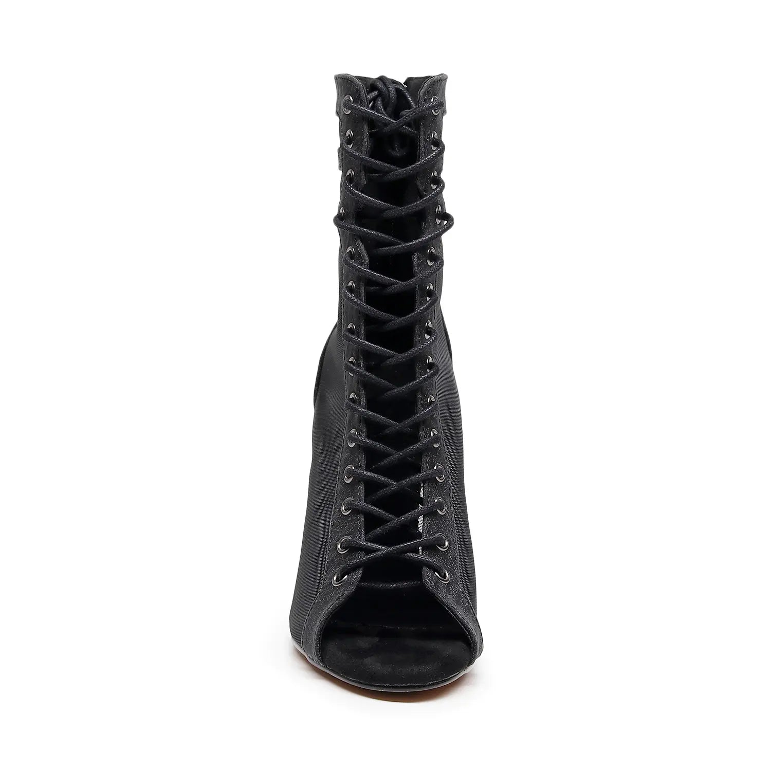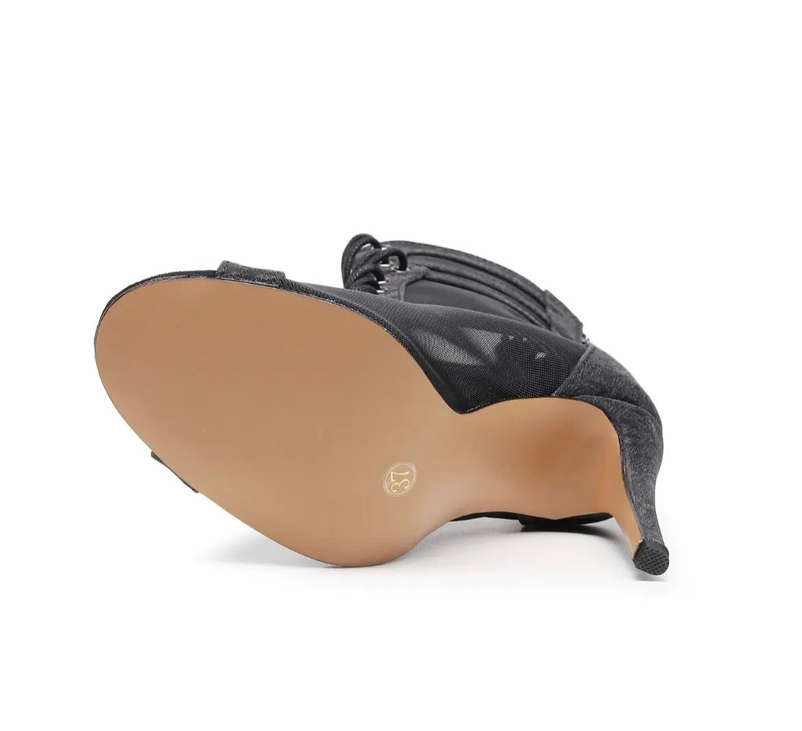 Los tacones de malla Ethereal en color negro ofrecen una combinación atemporal de elegancia y resistencia. La elegante construcción de malla proporciona una sensación de ligereza, mientras que el diseño con cordones añade un toque moderno a tu atuendo de baile. Estos tacones son la mejor opción para las bailarinas que quieren transmitir confianza y aplomo, dejando que sus movimientos fluyan con gracia y estilo sin esfuerzo.